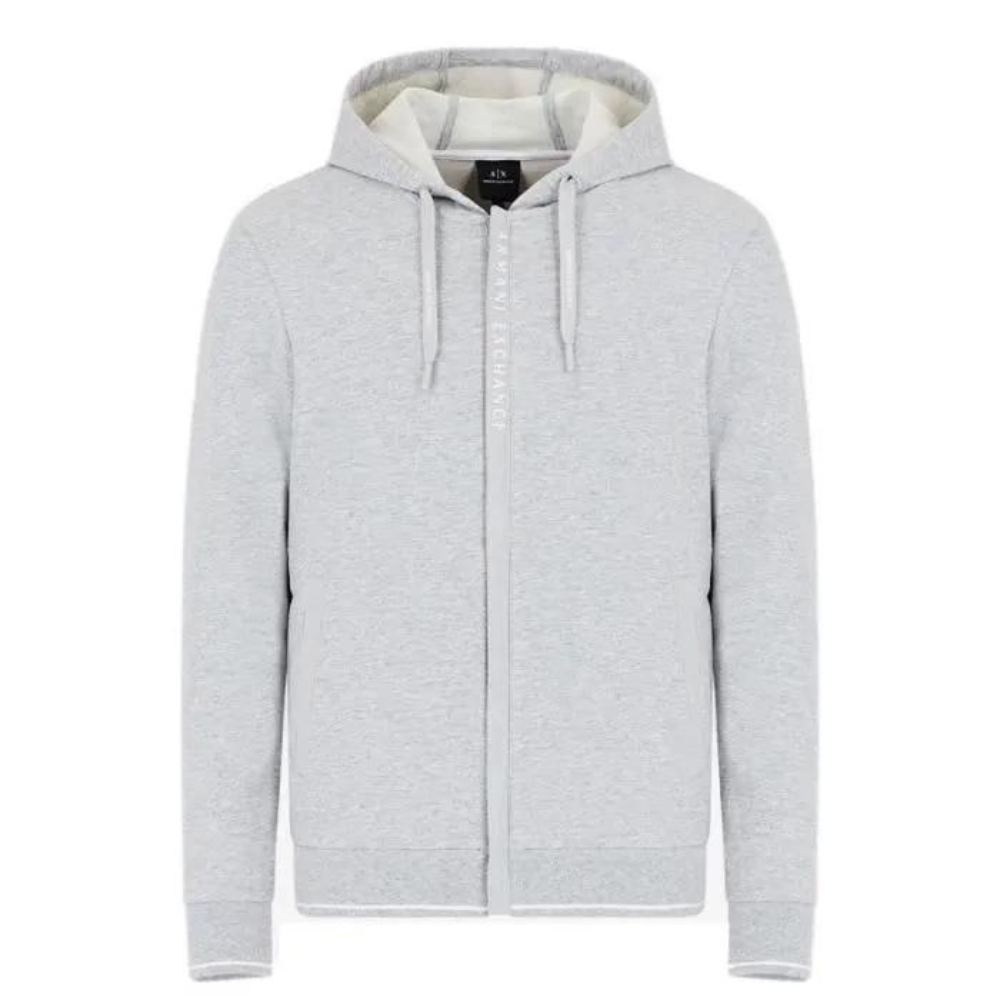 Armani Exchange hooded sweatshirt - Ref. 8NZM82 ZJH3Z 3901. Grey color. Details. - Hooded collar. - Long sleeves. - Crew neck model. - Zip closure. - Ribbed cuffs and hem. - Two side pockets. Material: 100% cotton.