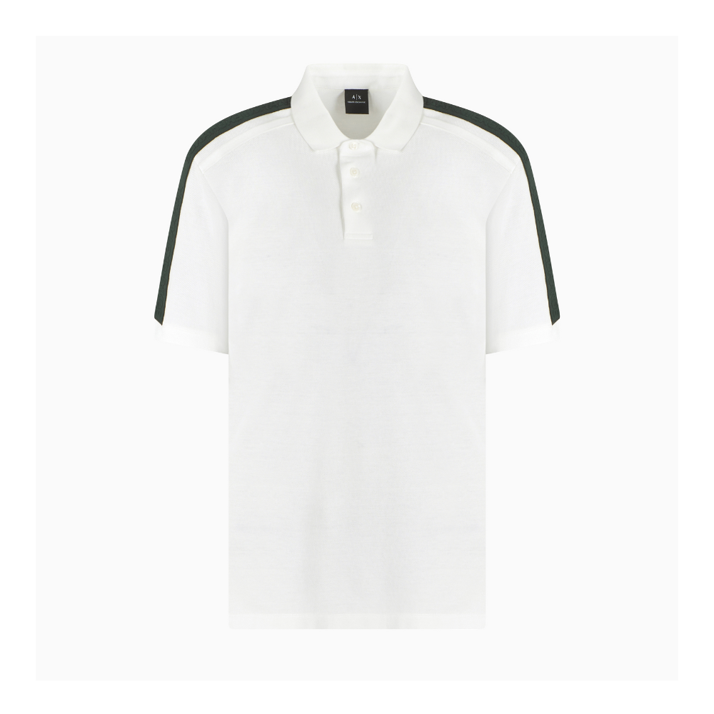 This Armani Exchange polo combines classic style with modern details for effortless casual wear. Crafted from breathable cotton piqué, it offers lasting comfort and a relaxed regular fit for easy movement. The standout contrasting shoulder bands add a fresh, sporty edge, while the ribbed collar and button closure complete the polished look. Perfect for staying comfortable and stylish throughout your day.