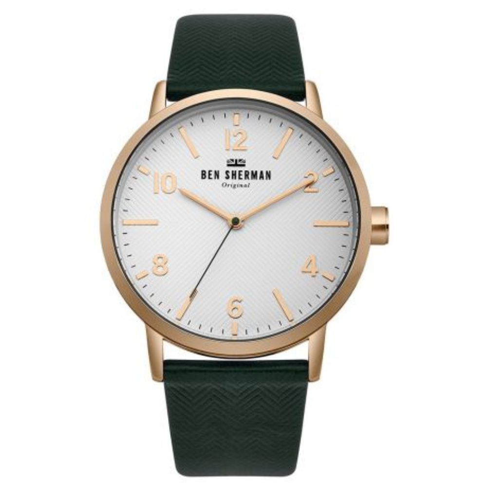 Features Case Material: Alloy Colour: Rose gold Width: 45mm Glass: Mineral Water Resistance: 3 ATM Dial Colour: White Strap/Bracelet Material: Leather Colour: Green Clasp type: Strap...