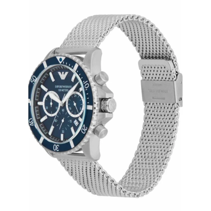 The Emporio Armani Diver Quartz Watch features a striking blue dial and a silver stainless steel mesh strap. Designed for style and precision, this sporty timepiece is perfect for everyday and casual outfits.