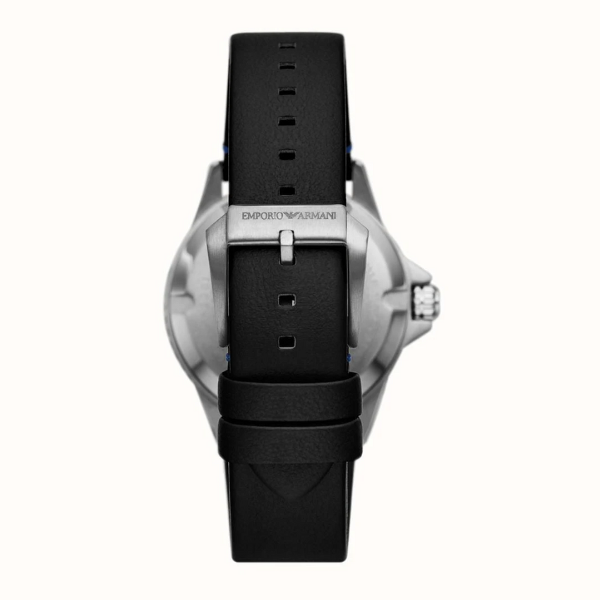 The Emporio Armani Diver Three-Hand Quartz Watch features a vibrant blue dial paired with a matching blue leather strap. Lightweight and precise, this watch combines sporty style with everyday functionality for men.