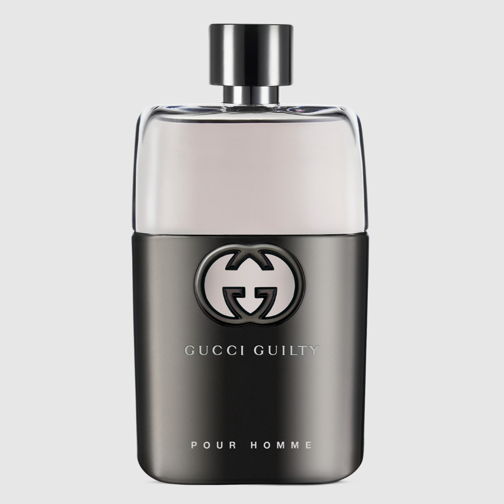 • Gucci Guilty Pour Homme’s grey clad bottle and cap complement the warm purple-grey colored scent. The Interlocking G logo defines the front.
