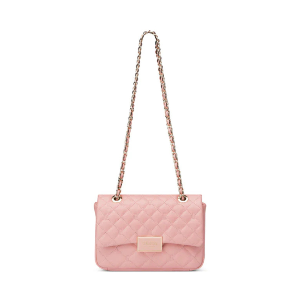 The GUESS Gwyn Mini Crossbody Flap combines elegant quilted leather-like material with sleek self trim and shiny pale gold hardware for a refined look. Compact yet stylish, it’s perfect for carrying essentials while enhancing any outfit. Lightweight and designed for women, this versatile accessory adds a touch of sophistication to your everyday style. VG959670