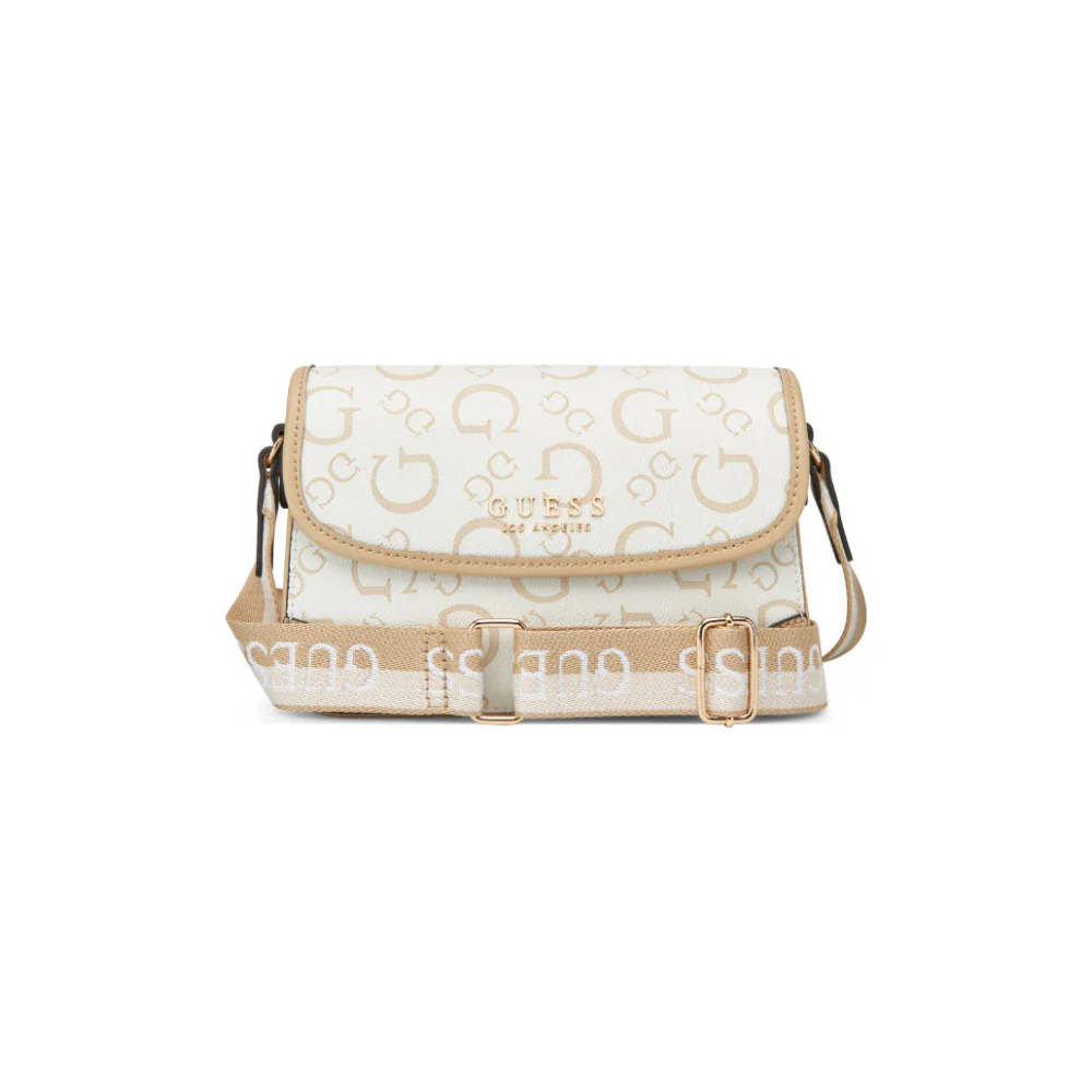 The GUESS Nichole Crossbody combines style and practicality with its sleek faux-leather design and distinctive logo print. Featuring gold-tone hardware and a logo emblem, this bag offers a rounded silhouette with a single compartment for easy organization. Inside, a lined interior with pockets keeps essentials secure. The fold-over flap with snap-button closure ensures quick access, while the adjustable two-tone webbed canvas strap provides comfortable, customizable wear. Measuring 9.25" W x 5.5" H x 3.25" D, it’s the perfect size for everyday use without compromising on elegance.