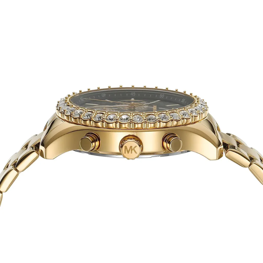 Imagine the sunlight dancing upon the glistening gold stainless steel bracelet, each link adorned with captivating crystals that shimmer with undeniable brilliance. The bold black chronograph dial adds a touch of drama, while the precision quartz movement ensures every second is meticulously tracked. With 50 meters of water resistance, this watch seamlessly transitions from boardroom meetings to glamorous evenings, always maintaining its impeccable style.