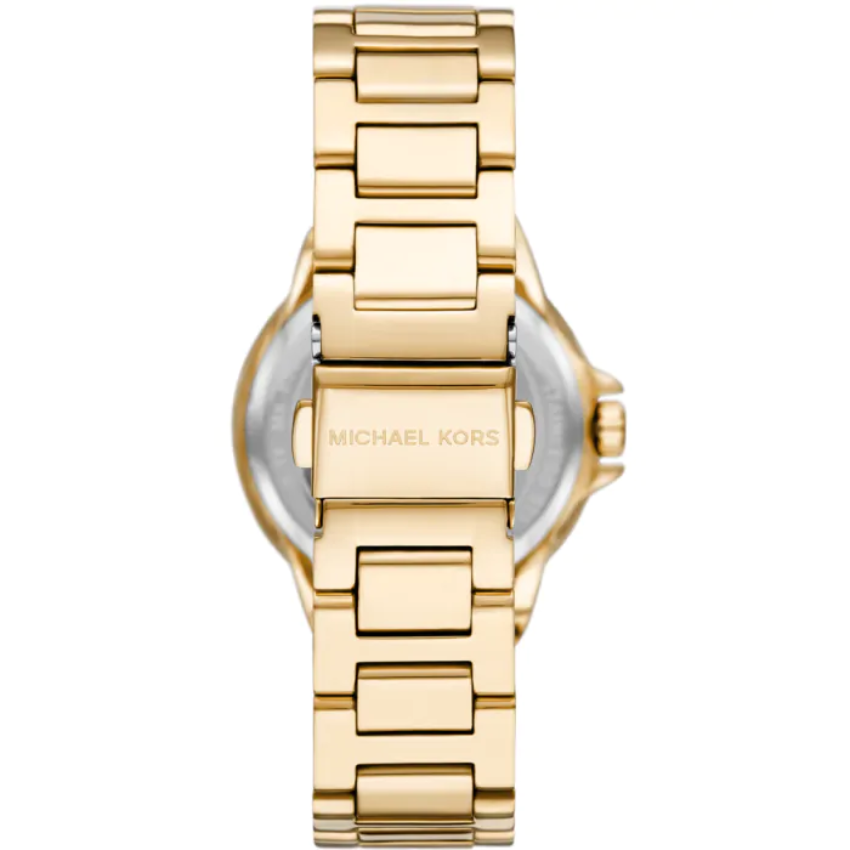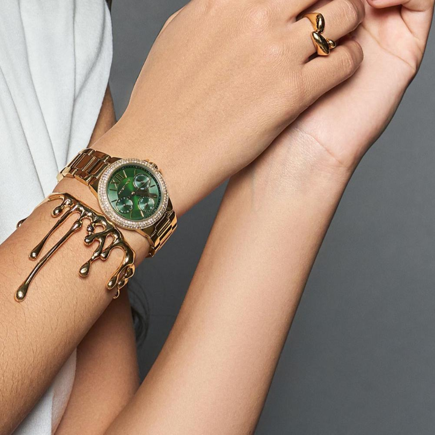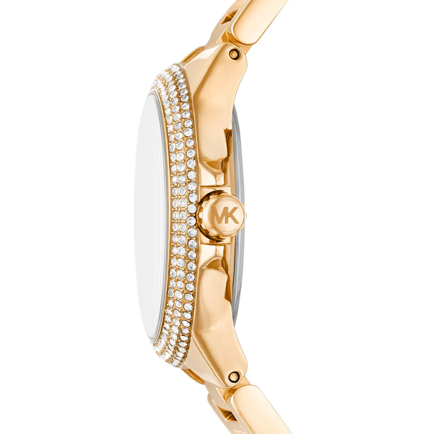 Michael Kors' 33mm Camille watch features a green dial, gold-tone case with pavé topring, multifunction movement and gold-tone stainless steel bracelet.