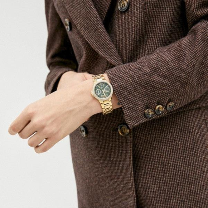 Gold-tone stainless steel case with a gold-tone stainless steel bracelet. Fixed gold-tone bezel set with crystals. Green dial with gold-tone hands and index hour markers. A Roman numeral appears at the 12 o'clock position. Arabic numeral minute markers (at 5 minute intervals). Minute markers around the outer rim. Dial Type: Analog. Three multi-function sub-dials displaying: day of the week, date and 24 hour.