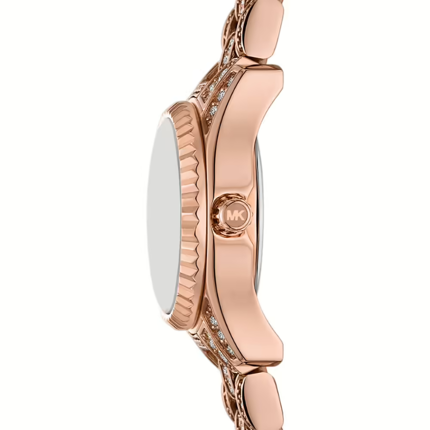 The Lexington watch exudes opulence with its rose-gold-tone hue and sparkling pavé accents. Made entirely of stainless steel, this micro timepiece boasts a round face with a beveled topring and a matching bracelet strap. Slip it on to give evening outfits a maximum dose of glamour.