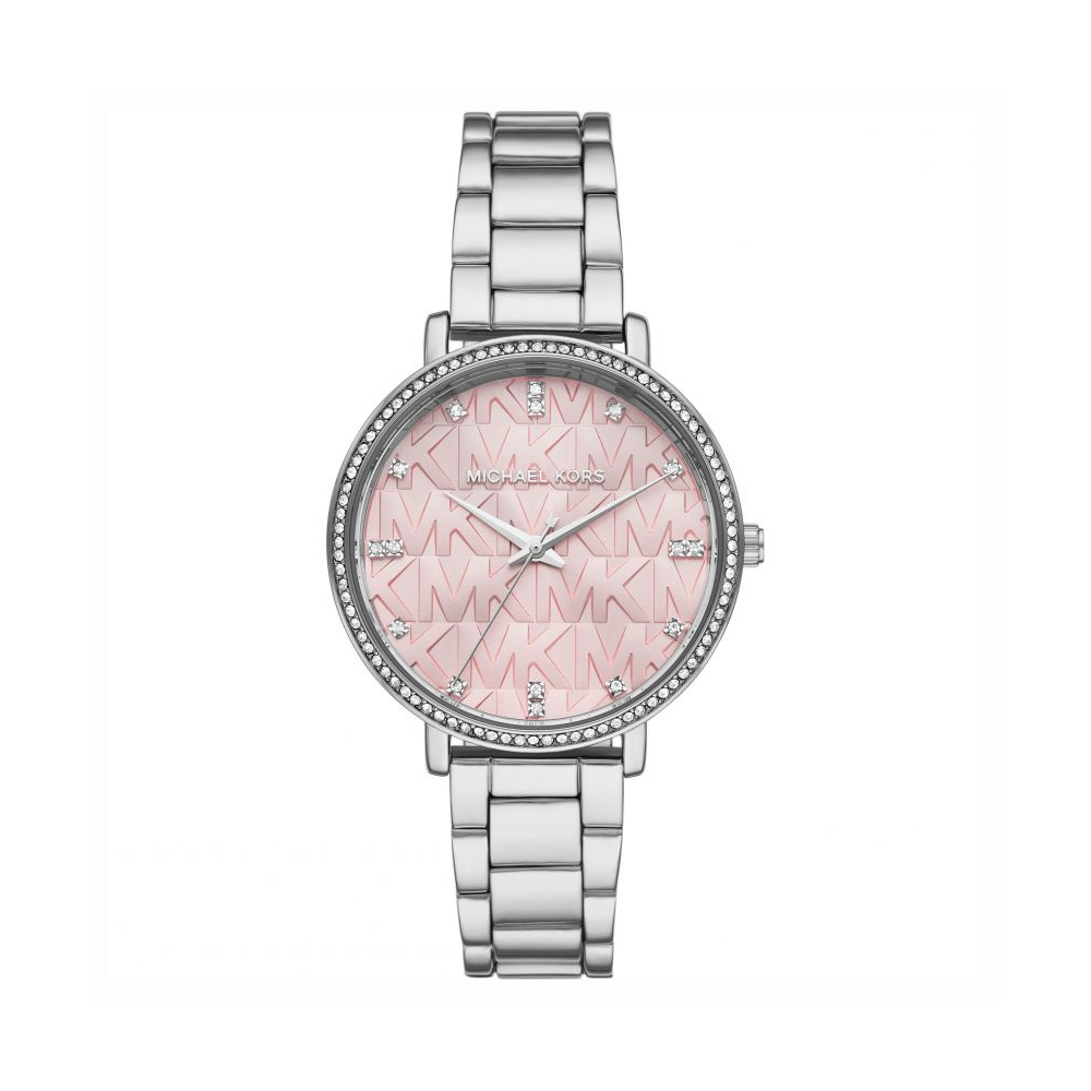 This Michael Kors women's watch combines elegance and precision with its 38mm stainless steel case and pink dial. Featuring a durable mineral crystal window and reliable quartz movement, it offers accurate timekeeping. The silver stainless steel band with a secure push-button foldover clasp ensures comfort and style for everyday wear. Its sleek, stationary bezel and slim 7mm profile make it a sophisticated accessory for any occasion.