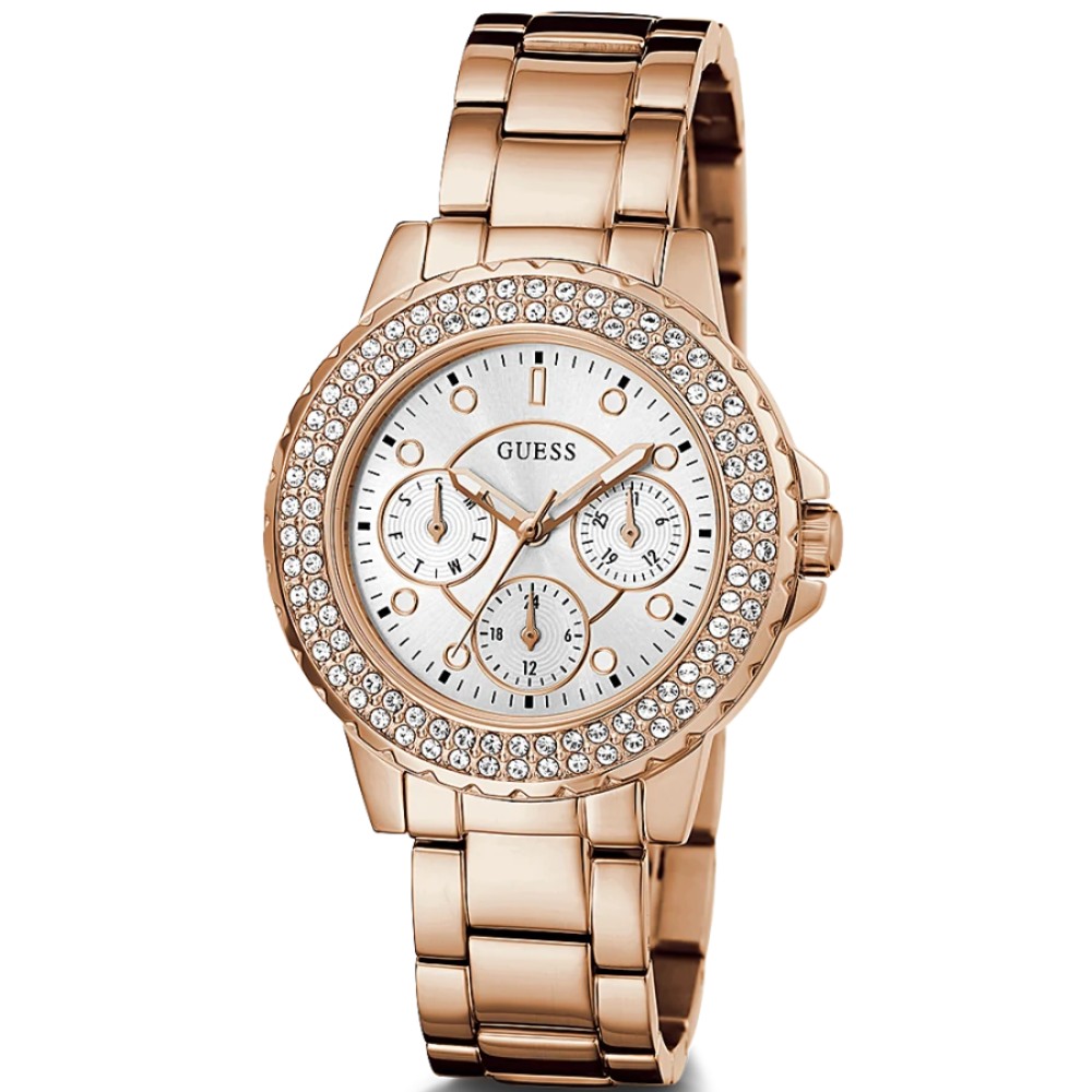 Our crown jewel of the season, this style offers a double row of delicate crystal details with a refined multi-function dial paired with a polished 3 link bracelet
