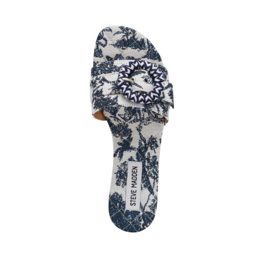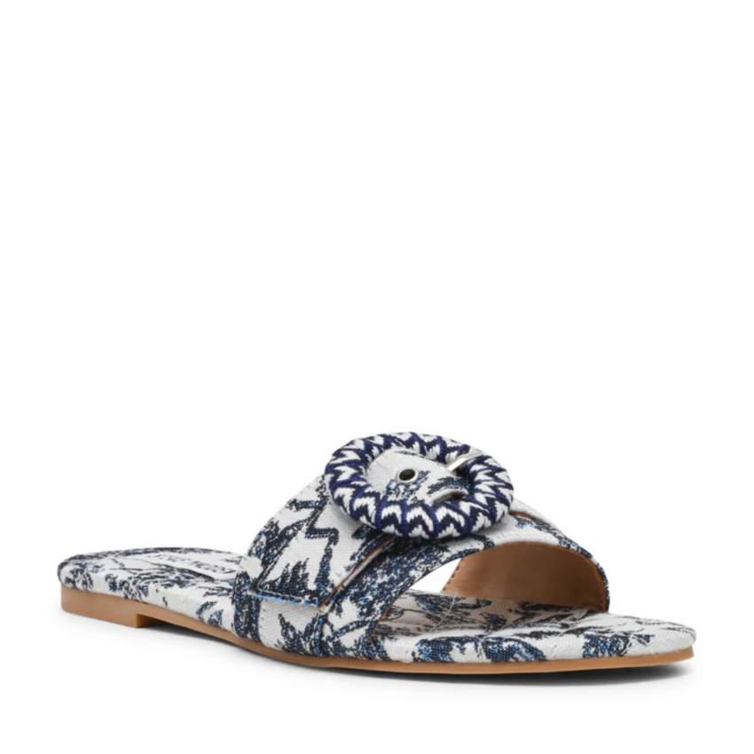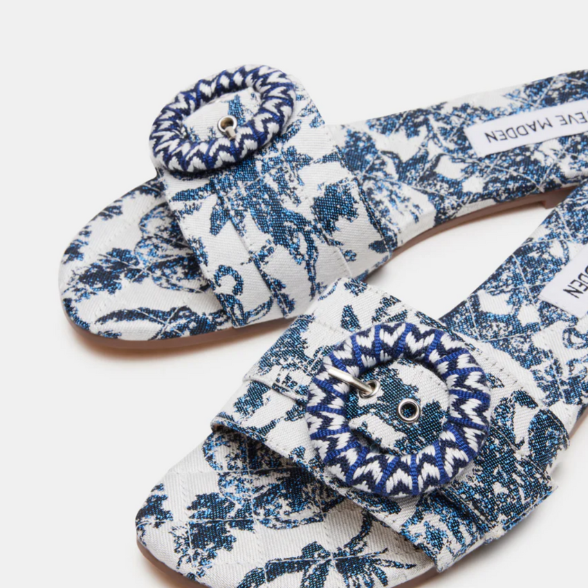 The MERLA flat slide sandal is designed for both style and comfort. The decal on the strap adds a touch of elegance to your step. Perfect for any occasion, these sandals offer the perfect balance of fashion and functionality.