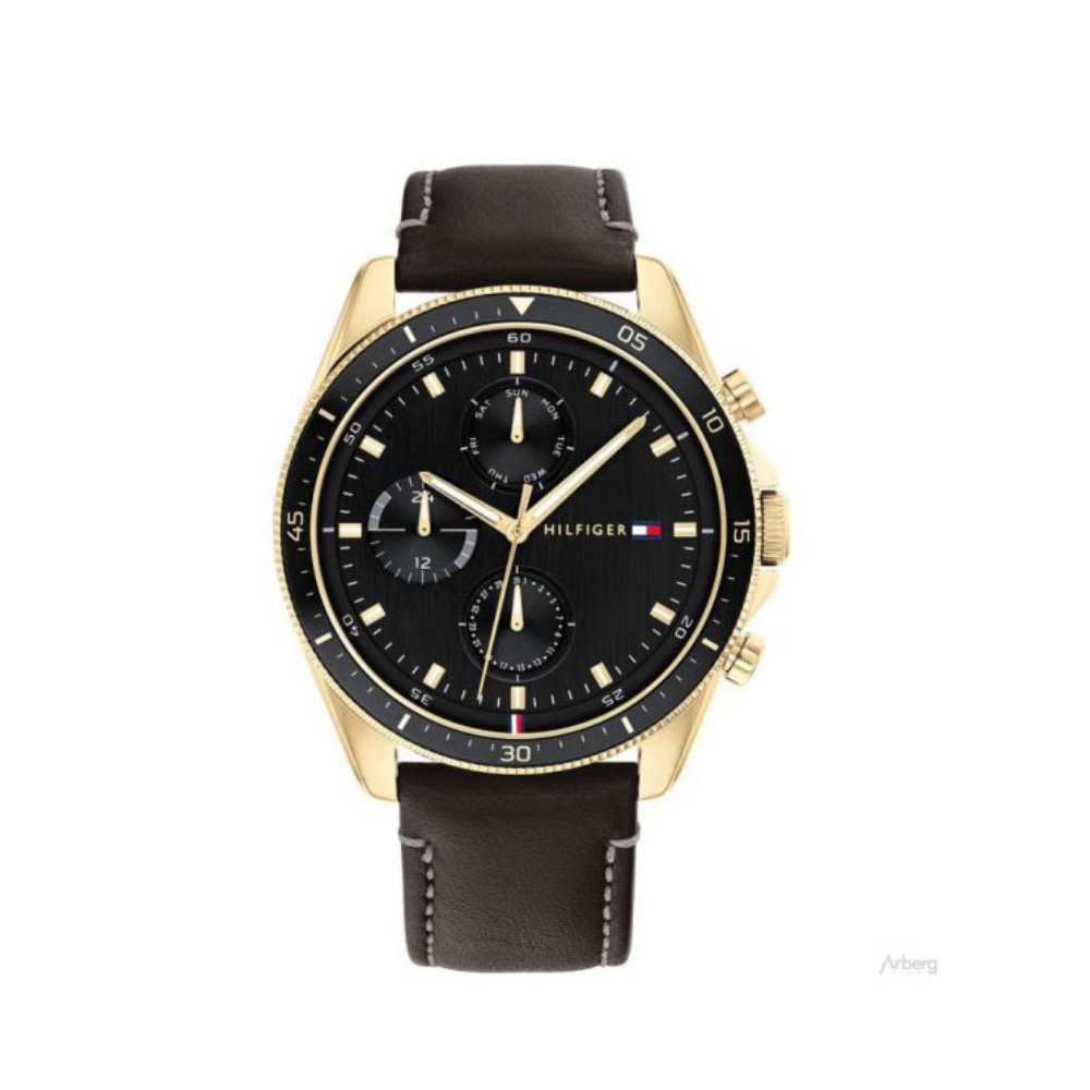 This Tommy Hilfiger men's watch, model 1791836, combines classic design with reliable functionality. It features a 44mm stainless steel round case with a clear glass dial window and a black analog display. The brown leather band, secured by a tang buckle, offers comfort and style. With a stationary bezel, day-date calendar, and precise quartz movement, this lightweight 76-gram timepiece is perfect for everyday wear and adds a sophisticated touch to any outfit.